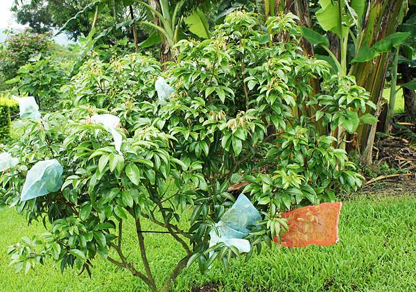 超大荔枝及糯米荔枝也都各幾枝可見小果成形,一枝雖僅一粒也套袋保護。酪梨與荔枝應該都是已得地氣,預告明年將豐收,勿負楊老農苦心呵護。