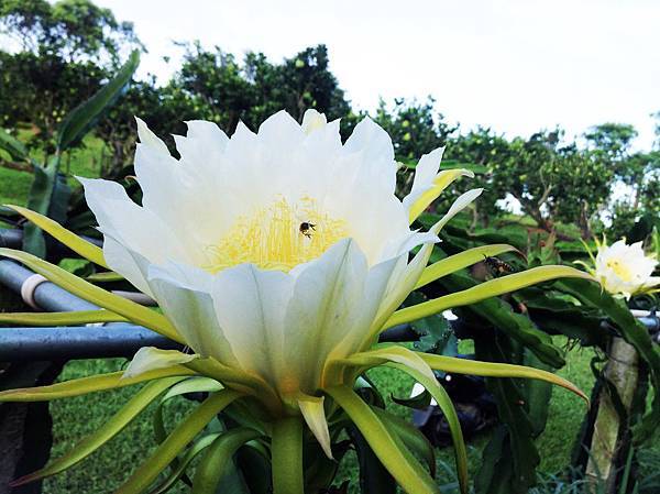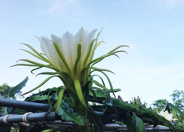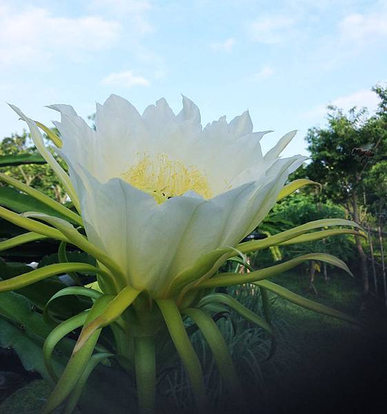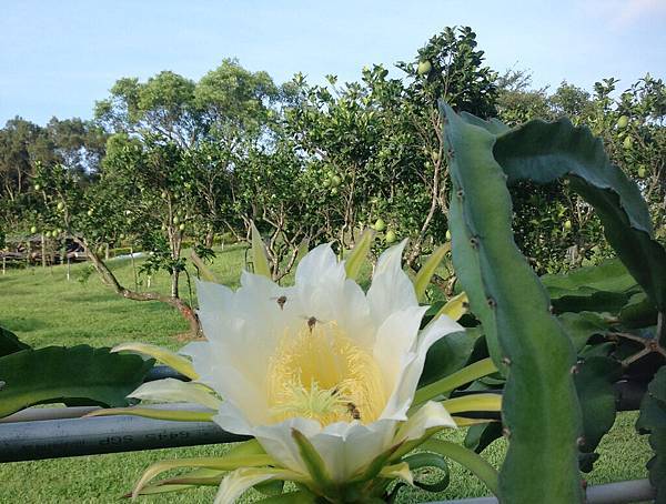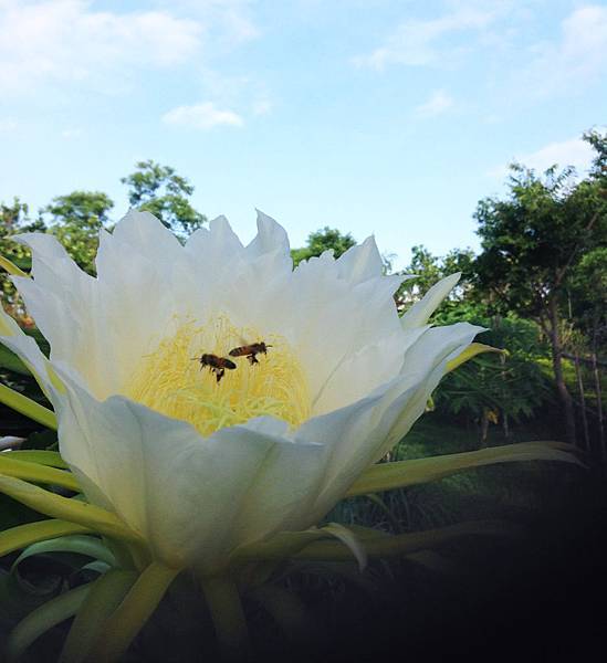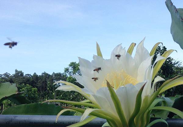 張園主每日晨五點起床,繞行社區散步運動,請託得便幫忙照幾張火龍果花,張園主在各方位於各角度照了卄張高解析照片。方知紅龍果花清晨還是盛開狀,眾多蜜蜂採蜜傳粉,網路上有許多火龍果花照片,但未見過在藍天白雲下有蜜蜂飛舞的火龍果花,網友們有幸看到此美景,與楊老農一同謝謝張園主。