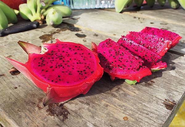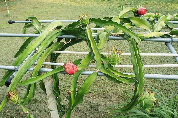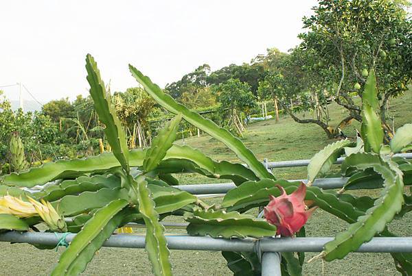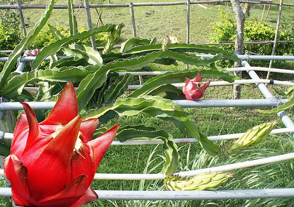 以前吃紅龍果總覺得不甜又有草腥味,原非喜好之水果,只為湊數成百果園而種,現今發現花美果營養,味道也變好吃了,尤其最喜愛的是其生產調配合宜,不斷開花與結果,每週成熟果五.六個,夠吃又不會難送,P園每年水果產量遠大於自己能食用,但實際吃的水果仍大半靠市購,多幾種像紅龍果及木瓜源源不絕陸續成熟,楊老農的水果錢就可省下了。