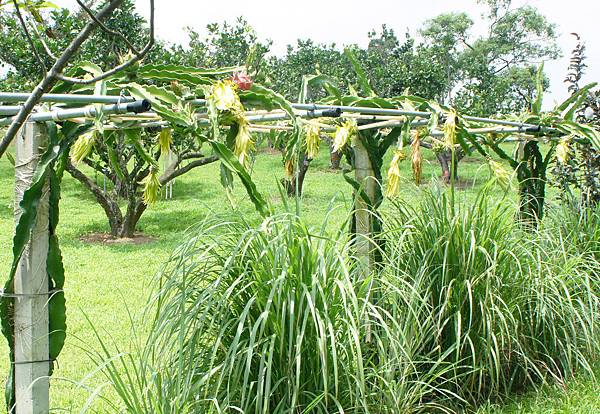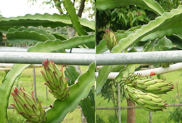 紅龍果初開時經常疏蕾,每枝條只留一朵花,但是園外等自然栽培派認為多此一舉,它們會自然落花或擇一暫緩生長。近來因忙於風災善後、貴賓相繼蒞臨,半個月沒有檢查疏蕾,如今棚架滿佈大花苞及初謝花卅餘朵,不但一枝條多花苞,甚至於擠於相鄰節點,如此不但營養分散長不大,甚至成長空間也不足,趕緊摘下許多姆指大花蕾,還有六個大花苞。