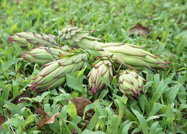 大花苞棄之可惜帶回當蔬菜,網路介紹紅龍果花食譜,煎煮炒炸甜鹹口味均適宜。對剖去蕊切小條,加點蒜頭辣椒清炒熟就很美味。