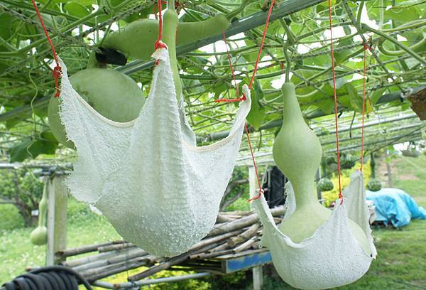 寫農夫日記難得看到迴響,好像都在自說自話顧影自盼,頗為落寞失望,只有炯台學妹經常MAIL或悄悄話留言關懷與鼓勵,月前請託改為明發迴響幫場,果然獲得熱烈回應,多位讀友加入討論,獲迴響百分比由40%增加為200%。對於瓜圃雜草束手無策,承蒙多位提供寶貴意見,市有瓜田專用黑色薄塑膠布,能有效防草,但是入秋收瓜後,塑膠布下是光禿禿黃土,要復育出碧草如茵得等上半年就非所願,瓜與碧草不可得兼,捨瓜而取碧草。不論西瓜.南瓜.蒲瓜都讓它們攀上棚架,是使瓜與草坪得兼之法,去年怕大葫蘆太重,就是讓它們躺吊床上成長,日本農與楊老農算是「農夫所見略同」。