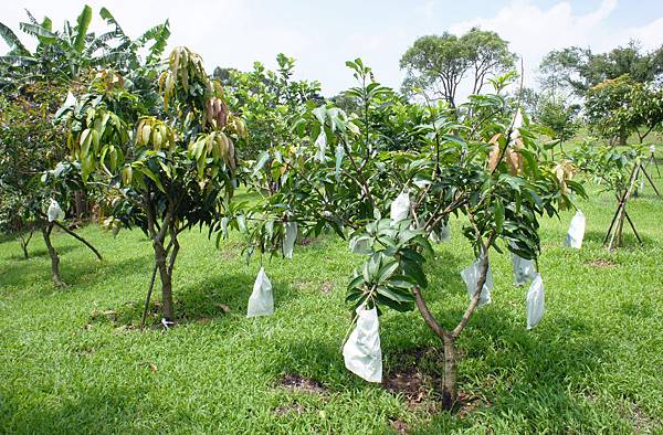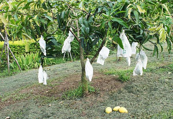 陸續種植芒果八株六品種,有金蜜、紅龍、四季、蜜桃、黑香及土芒果(獨缺最普遍的愛文&金煌),金蜜購入時樹上掛著11顆仔果,成熟後卅餘人分嚐,都稱讚金蜜芒果好吃,目前仍為公認P園最好吃的水果,樹已比初植時大數倍,但是三年來粒果未收。去年八株芒果樹只有紅龍結卅幾個,今年只有四季芒果結了卄幾個。