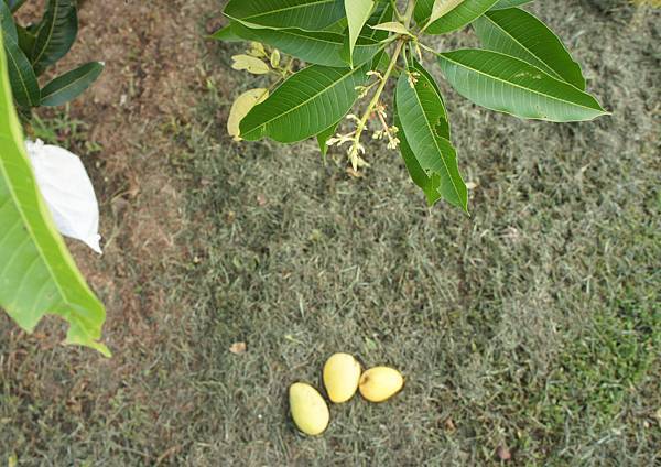 四季芒果樹下發現有三個熟落芒果,自然掉落之成熟水果是最好吃的,再加上情感因素當然更加美味,其形色口感等都類似金蜜,只是每項分數都要低兩成。四季芒果強項是一年兩收,果熟落地時枝梢又冒出花芽,春節過年時有新鮮芒果亮相,其光彩又將獨佔鰲頭了。