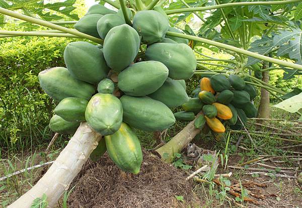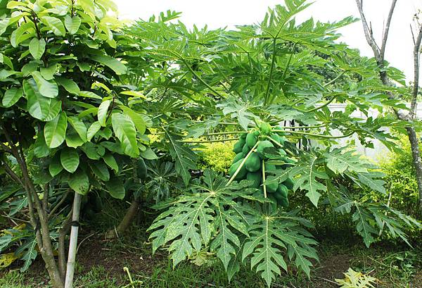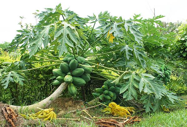 前文報導樹萌夏枝,有讀友明察秋毫,看到蘋婆發夏枝照片背景木瓜結實累累,希望多瞭解這幾棵看起來不錯的木瓜。原都種植的高價接芽木瓜,但去年梅雨破60年雨量記錄淹死,堆肥坑中挖三株自發實生苗遞補空缺,沒想到它們特別會結果,月前蘇力颱風把樹吹倒,但果及葉都未損傷且相繼成熟。