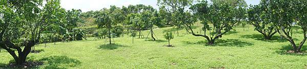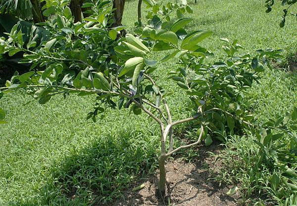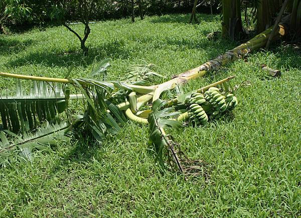 前兩張全區照片看起來連樹葉都沒吹掉,只有文旦掉落十餘粒,倒伏兩株掛果蕉樹,都算不上損失,倒是無子檸檬因風壓加果重枝幹劈開比較心痛,因裂而未斷以繃帶固定接回,這枝是中心主幹希望能接活。