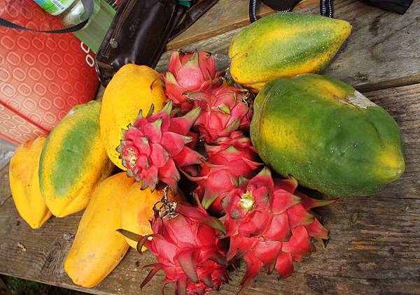 秋收時節瓜果成熟,紅龍果及木瓜同時多粒成熟,慶豐收不忘鄰居深夜及清晨幫美花照相,送上紅龍果木瓜酬謝,人人誇P園紅龍果好,有市買品沒有的香味及口感,小蘇說楊老農土生木瓜甜又有濃郁木瓜味,已久未吃到這種真正木瓜了。