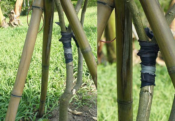 有網友質疑:檸檬枝幹從中裂開,可以這樣綁回去嗎?感謝Peter及炯台兩位師出同門專家都支持楊老農的作法,又不約而同教導:還要加支撐架固定。又有康芮颱風路過趕緊釘竹竿捆綁,確保接著處不會受力移動。