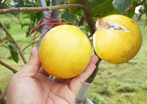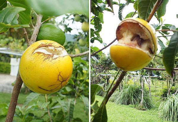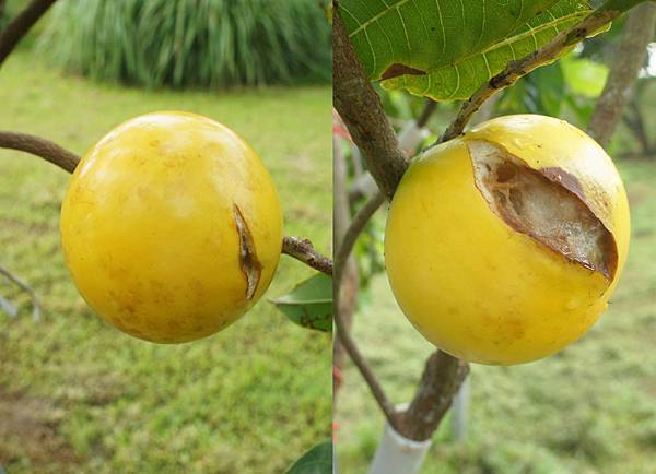 為求文旦甜嫩好吃耐儲存,一個月前停止澆水,人算不如天算連續超大豪雨前功盡棄,楊老農果園位於山頂,雖然不會淹水,但是乾旱之土壤驟然泡水,果肉大量吸水而引起細胞迅速膨脹產生的裂果,黃金果樹上最後之果全裂,連種子都裂開發芽。原嫌P園黃金果個頭小,如今灌水後大了很多,裂果不能再放,只有獨自大快朵頤,又是禍兮福之所倚,失不一定是禍,沒有挫折就不會有智慧,沒有付出難有收穫。