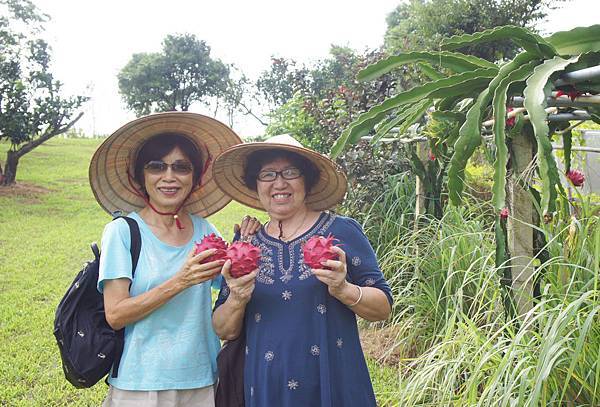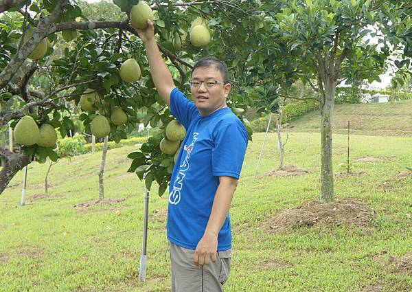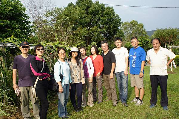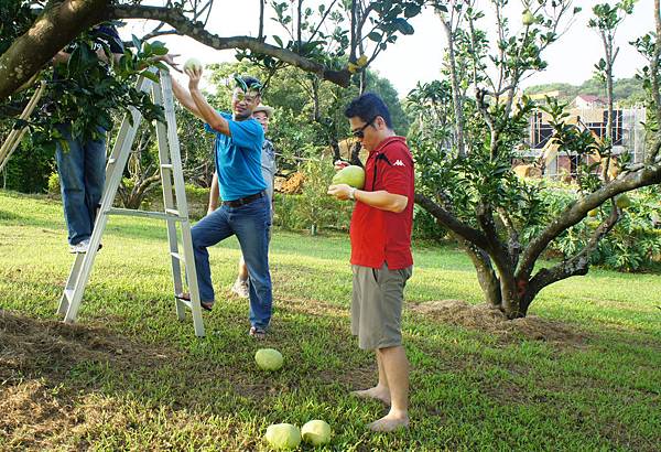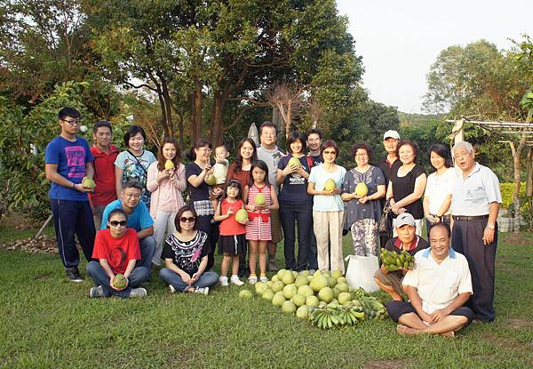 週日第二梯次拱豬社及TYC同事共23人,O園兩園主具有三重身份,但因另有事已提前摘了文旦,遺憾今都缺席。四十年前進TYC時兩位對我提攜教導老長官之夫人,今首度光臨親手摘文旦,老夫人身體健朗全園上下遊走,大家都讚紅龍果.無籽芭樂香甜好吃,昨天女兒還評紅龍果為園中最好吃的水果。今年3~4月文旦開花期連續下雨,受粉不良著果率低,以致眾賓分得文旦不及去年1/3,迷福親友多也都愛楊老農水果,滿懷希望遠道來,看他失望表情至感過意不去,只盼明年能夠補償佳賓。