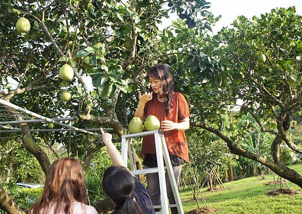 一年一度盛事歡聚摘文旦,往年收摘前停澆水一個月,今年久雨初晴才一週,果皮果肉含水量都高,除了甜度較低外還容易腐壞,所以各梯次人馬都勤前說明,摘取以撇折方式不留果蒂,免得果蒂刮傷外皮造成爛源,輕傳緩放避免摔壓,若震破果瓤薄膜果汁滲漏會由心部腐爛。文旦自『白露』後開始採收,置於乾涼通風處,收摘保存得宜者可存放數十天,文旦辭水後表皮多餘的水分蒸發,使原為淡綠色的外皮轉變為黃綠色,此時文旦的甜度會相對提高,口感風味更佳,所以縱然過了中秋節,仍為文旦的品嚐期。