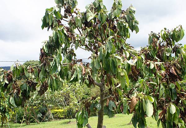 月初連續超大豪雨,果園位於山頂雖然不會淹水,但是土壤中充滿水,樹木根部長期泡在水中,根群無法呼吸腐壞,根壞吸水不足,再加雨後放晴豔陽曝曬蒸烤,週前發現樹體缺水葉軟弱低垂,還在猶豫Hass酪梨成熟期為十月~二月,樹上掛著第一次結的唯一碩果,正逢成熟期前不知僅有碩果該摘該留。