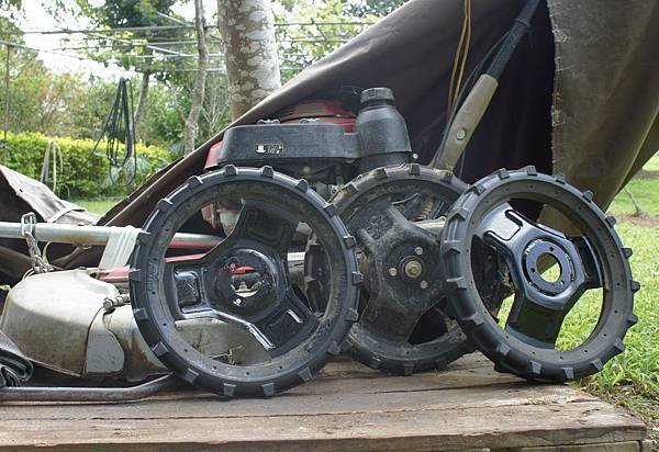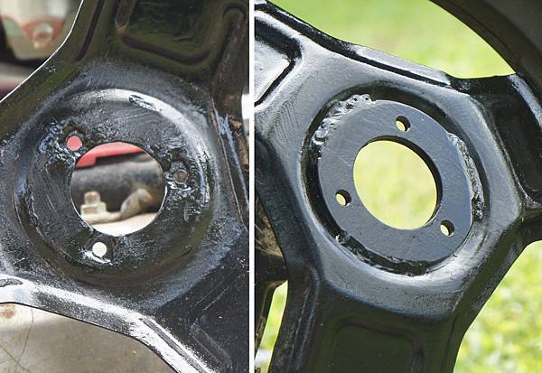 自走割草機輪圈斷裂,購新輪價格超過轎車鋁圈加輪胎,損壞之輪只是輪圈固定於輪轂之螺絲孔破裂,就這樣棄之實在可惜,另補焊接一片輪圈中心板重鑽固定孔,另只舊輪也加焊一厚片補強,這樣兩輪就將永遠操不壞了。