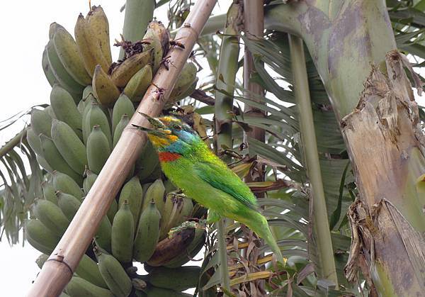 矮蕉結果正好與人同高,成熟時能黃一根摘一根,黃一把割一把隨心所欲,但芭蕉樹高聳,果實超過3M高,每次割取要兩人以上慢慢放倒,但是今天O園兩園外都名副其實,不肯來幫忙。可能這串芭蕉特別好吃,有一對五色鳥及許多白頭翁圍繞啄食,還有大群馬蜂盤旋穿梭,不知馬蜂是來吃蕉,還是內有馬蜂窩,不敢招惹它們,這串芭蕉就留給五色鳥慢慢享用了。據張園主說:春天農莊的五色鳥不怕人,他澆水時常有五色鳥來洗澡,對著噴水它更喜歡,慢條斯理一根根羽毛搓洗。