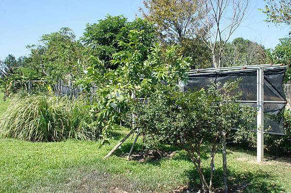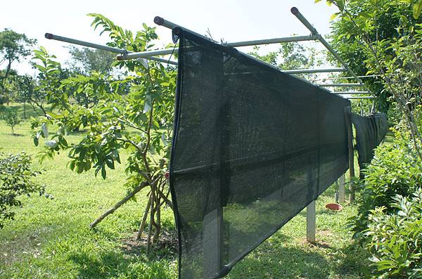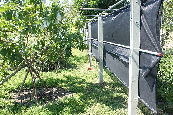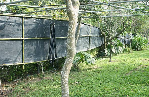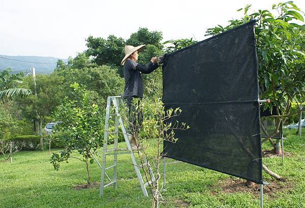 訪客熱季過東北風季到,每年例行公事請小蘇幫忙裝上防風網,東&北兩面舊網再掛上,加強保護之熱帶樹單片網立回,但是金蜜芒果樹已長大不能全樹保護,防風網片重搭加寬1m,高枝剪掉或拉下將樹枝都納入遮蔽中。