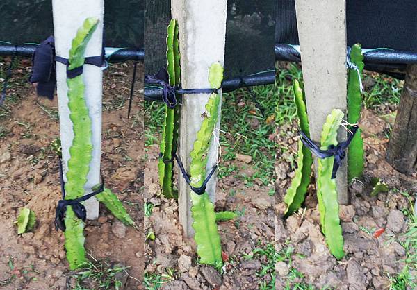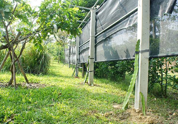 P園紅龍果眾賓誇獎遠勝市場品,女兒更讚為P園最好吃之水果,加上產季長達半年,陸續不斷開花結果,隨時有成熟果享用及待客,又不會有難送之困擾,在三根水泥柱頂架上縱橫錏管,變出多一倍紅龍果棚架,今於每枝柱東南西三面各插枝一段紅龍果枝,利用防風網柱既不多佔土地,成長後貼佈綠枝幹美化水泥柱,兩年後又有豐盛收穫。