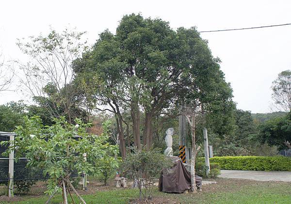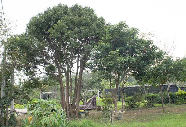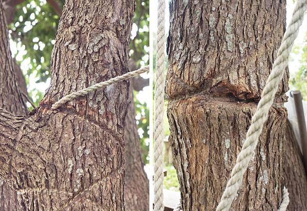 兩年前在園門旁之樟樹與櫸木間掛張吊床,樟樹幹變粗,纜繩緊箍深陷樹體,立幹還可鬆綁挖出換個位置,但枝椏分岔處已是雙幹合攏,繩索鑲嵌於樹體中,也只有隨它了。