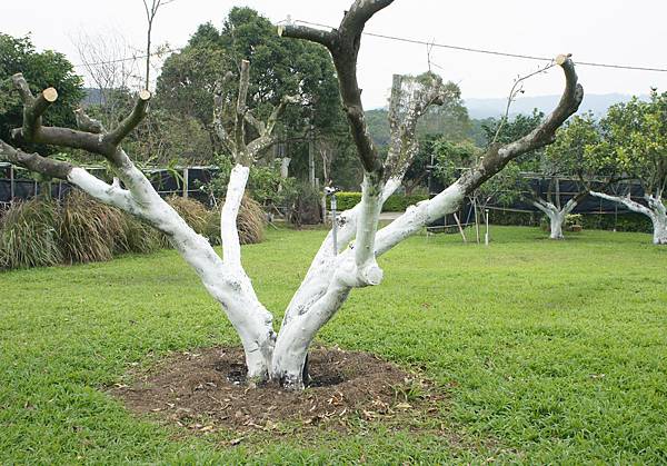 No.6文旦枝幹鋸掉,沒有樹葉遮蔭,耽心樹皮受不了直接曝曬,塗上自調「類波爾多」-石灰加少許氫氧化銅,就像穿一件白衣服保護它,能夠使陽光被反射掉。