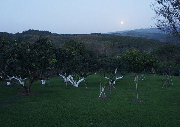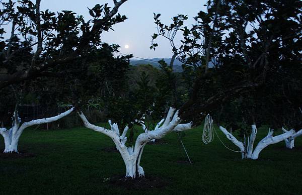 塗漿費時兩個工作天,第一天作到月亮高掛,月光下成果明顯,暗影中只見白色樹幹清晰醒目。