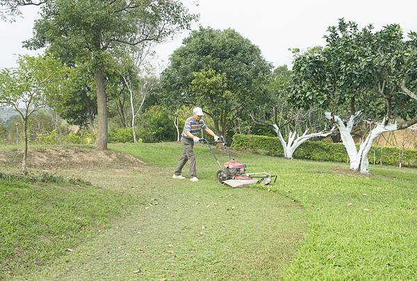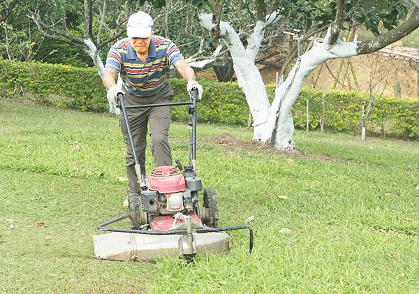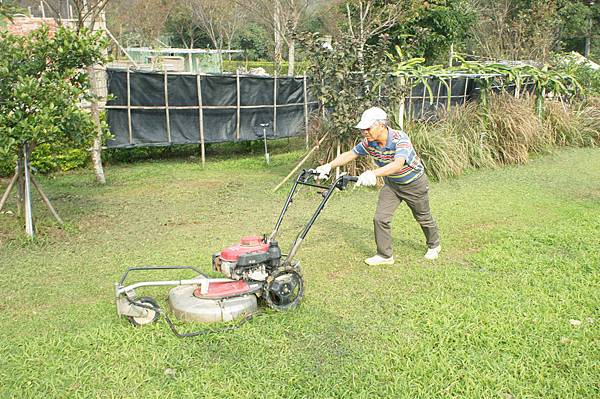 Charles月初幫農扒草,今離台前最後週日再蒞園,上次扒草把手皮磨破,這次請他不要動手,躺吊床讀佛經或與王園主聊天。Charles美國的庭園有P園八倍大,看楊老農割草手癢堅持要玩玩,只告知左手管刀片,右手控制前進,他就駕輕就熟割起來,上下坡.越土坑.過小丘,該翹該提操作自如,遇樹轉小圈都難不倒他。