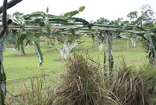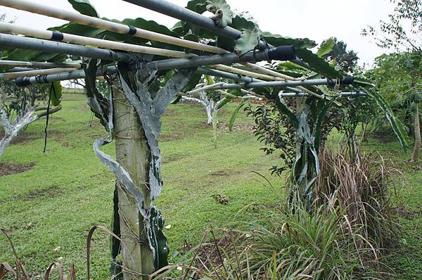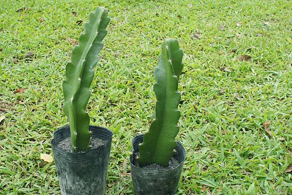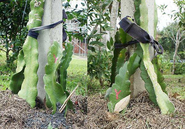 Mr.沈推薦P園種植黄龍果,到熟識花圃請其幫忙找黄龍果,不料店內原就有各品種之火龍果苗,立即買下兩盆黄龍果,擠種於新增建紅龍果架柱旁,種在一起分不出黃&紅之間差異,只得漆寫「Y」註記,待來年結果品嚐比較,如果真是甜度高為火龍果家族中之極品,就將新棚架都接枝為黄龍果。