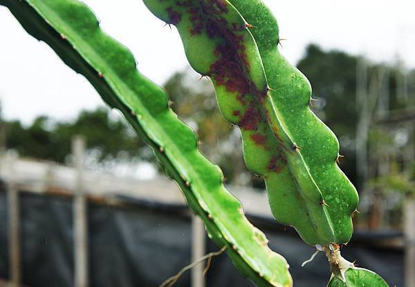 網路上查資料:「火龍果在連續下雨後易發生潰瘍病,發病初期在肉莖上會形成淺綠色的淡化小斑點,再擴大成紅褐色潰瘍斑點,發病後肉莖呈水浸腐爛,嚴重時會腐爛到僅剩中心的維管束,可調配波爾多液施用。」