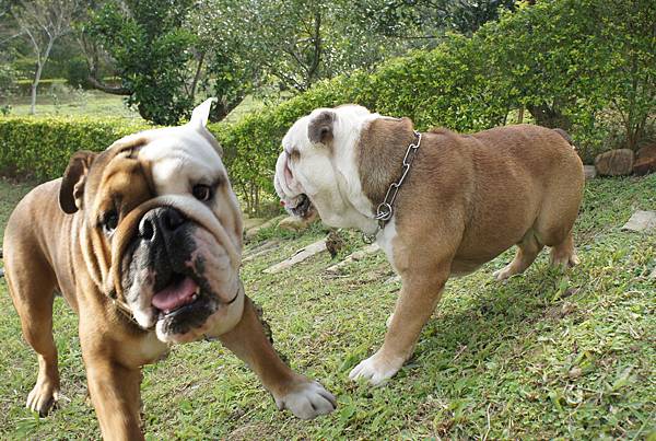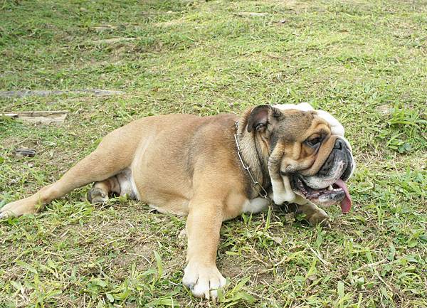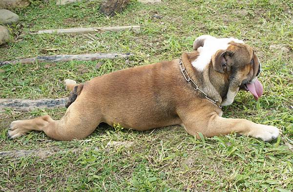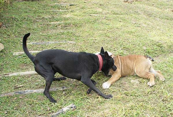 會買塊農地住到鄉下,必定是愛好大自然之人,會喜花木也會愛動物,春天農莊眾鄰也養各種寵物,P園地平緩又綠草如茵,鄰居愛犬都喜歡到此遊戲,胡園主帶鬥牛犬來運動,看胖嘟嘟身軀跑跳很有趣,牠上下陡坡奔幾回,就四腳長伸攤平了,還沒有「鬥」自己先氣喘如「牛」。