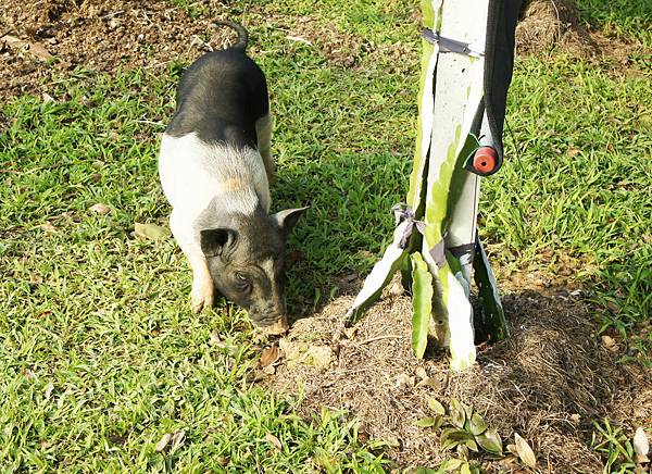 有的鄰居畜養之豬、狗都放任莊園自由行,兩隻黑狗經常到處翻攪垃圾,還有多次咬人記錄。麝香豬也是P園之常客,楊老農水果成熟時有果子貍及松鼠肆虐,麝香豬連未熟水果也照吃,並且食量又大。