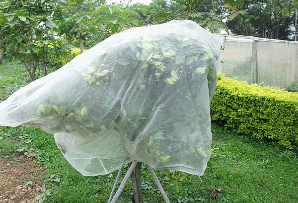 日前怕被鳥啄食,循例罩上紗網,去年寬鬆網今年已擁塞,原本是長袍再穿變馬掛。