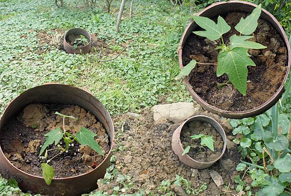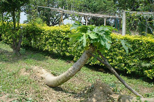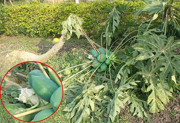 木瓜壽命約二到三年,為保持年年有生產,每年都要新種兩株,新陳代謝永遠保持有收成,買兩株新育種木瓜-台大選系10號,據宣稱:其果肉厚緊實果腔小,耐寒耐乾抗病力強,無需網室可露天栽培,為防颱及摘果方便,採橫植法初期要不斷壓芽保持橫長,明年可與東南亞大木瓜比比那個最好吃。