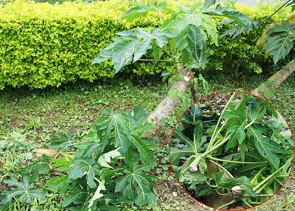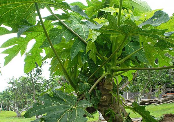 去年底工作不慎將木瓜樹撞斷,滿樹青木瓜分送鄰居燉排骨湯,殘存樹幹入春後於每節間冒出新芽,僅於樹頂保留三芽其餘抹掉,如今茂盛如昔,又開始出花苞,結果後枝幹間距離小容不下大木瓜,再切除兩芽獨留一枝。