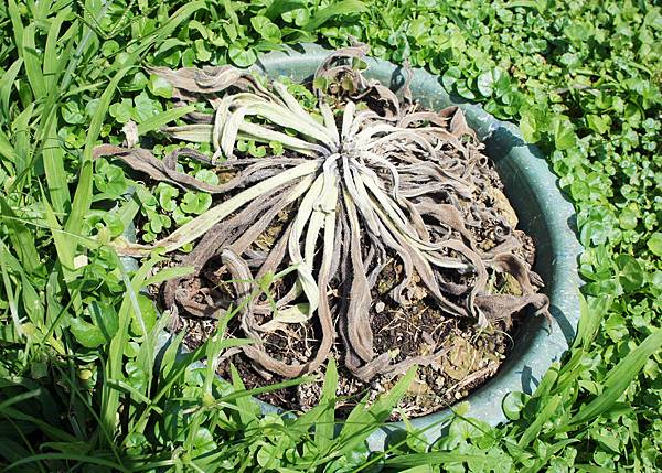 珠寶塔原本日長夜大,因其葉層層疊疊包裹,心部會積水,進入梅雨季節後,先見其中心嫩綠凋萎,沒幾天就整棵乾枯了。