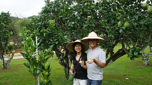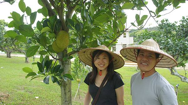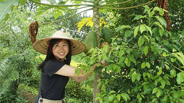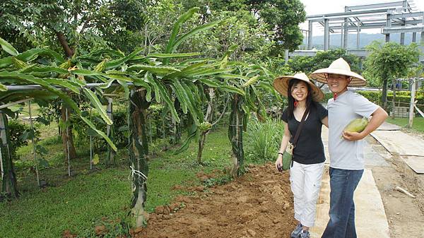 Lilian自幼農場長大,對所有果樹都有興趣,尤其首見掛在樹幹上之菠蘿蜜,滿棚架之紅龍果花及青果,今未能有紅熟果餉客遺憾,摘送兩個僅有的巴掌葫蘆,還是摘個木瓜.割把香蕉應景。