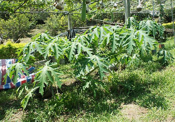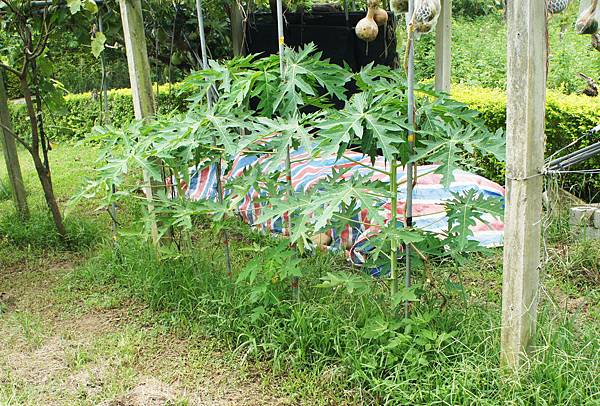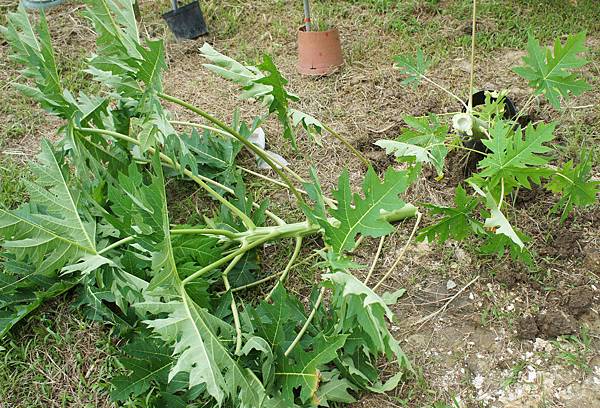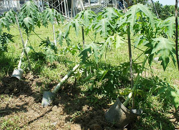 瓜棚下高度不夠木瓜生長,棚架尚有絲瓜陽光也不足,再為管理方便及防颱,必須將其向外放倒橫植,月前先試過倪正柱教授之倒株栽培法,在木瓜樹離地1、2 尺處剖切樹幹4刀,再壓低倒株,沒抓到訣竅可能剖切長度不夠,彎不到45°就折斷。