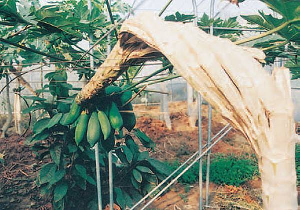 去年柬埔寨大木瓜首熟,吃瓜之餘立即撥播種育苗,但半年也不發芽,初春將其盆土另育葫蘆,葫蘆移植園地成長登棚時,發現緊靠著每株葫蘆基部都發出許多木瓜苗,當即明白是怎麼回事了,每位置擇優留一株寄存瓜下,等入秋後瓜藤枯,植地就遞補為木瓜園了。