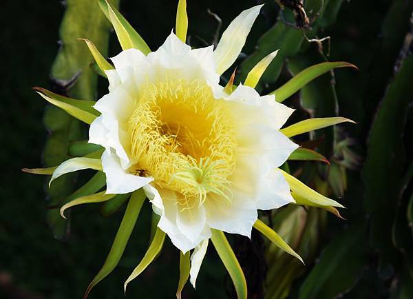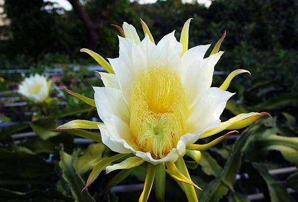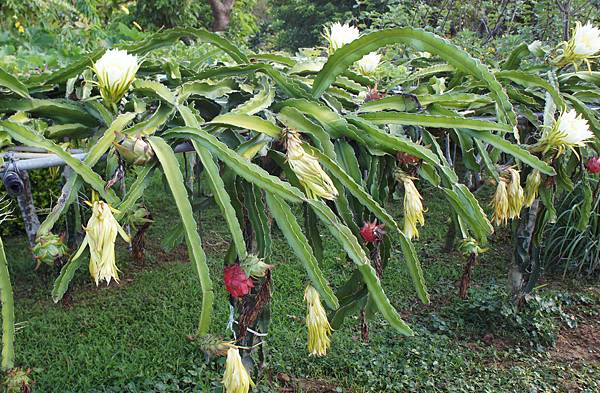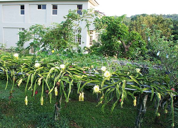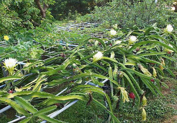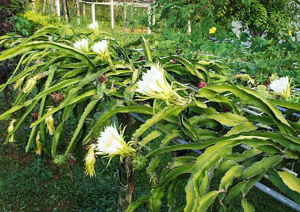 火龍果開花是由深夜到清晨,以前一直無緣欣賞美麗花朵,雖已多次圖文報導開花,但照片都是請託鄰居代為拍攝,自入住新農舍也就能欣賞美花,昨晚發現同時有八朵花開,今特地天未亮就起床拍照,遠近各角度貼上請欣賞。