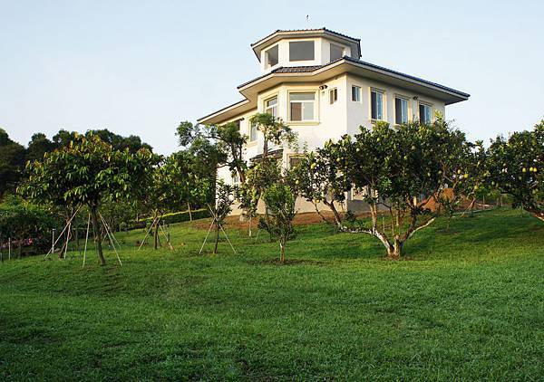 現居農舍聳立山頭,與東山遙遙相望其間無阻攔,六點太陽冒出山脊,陽光平射室內滿室光輝,人稱睡懶覺是「太陽曬到屁股」,總以為是十點以後,但對鄉居要修正為六點了。照完火龍果花後,順便攝張晨曦中的農舍,看看草地還沒有照亮,太陽光已灑滿牆,農舍益發美觀。