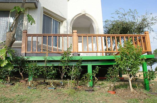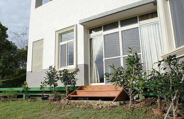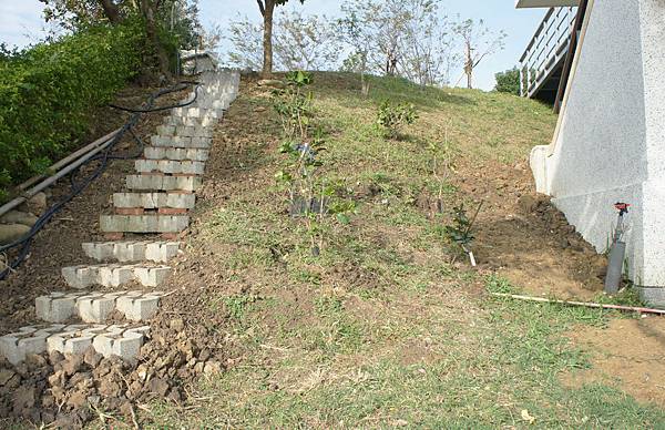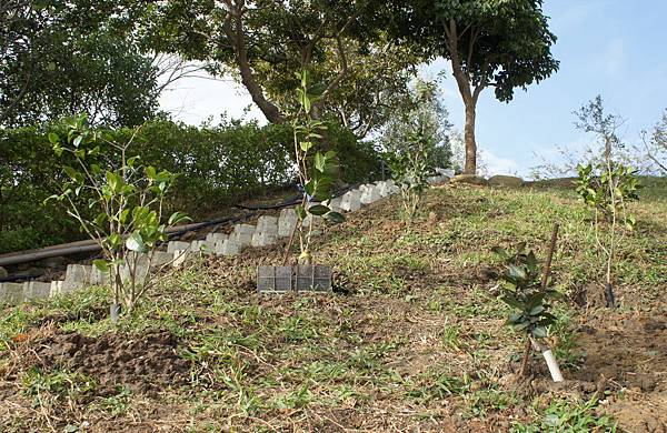 如今農舍新成,選定屋南朝東坡為茶花園,此區北風弱,夏季無太陽直曬,冬天也只有上午半天陽光,坡地排水好根無泡水之慮,應該是種植茶花理想場所。原有茶花建房期暫植於盆,今先入場定植,為便於管理已裝設灑水系統,為賞花重建植草磚步道,憧憬來年樹茂花繁景象,親友們文旦節後還有茶花季。