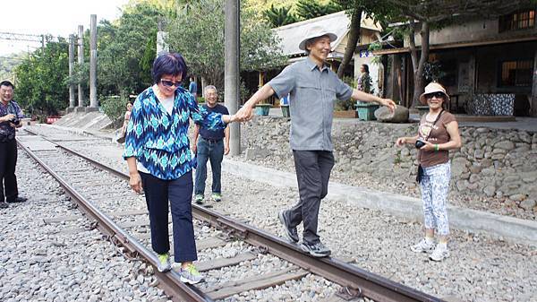 再轉龍騰斷橋,慶幸同學們中斷五十年之橋已再續。到勝興車站憶兒時走鐵軌,年歲長平衡感變差,難以如昔如履平地,但若相互扶持也是行走無礙。