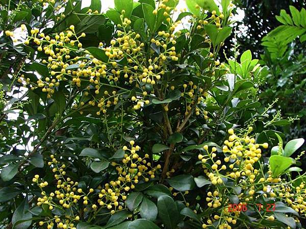 珠蘭學名樹蘭,又名魚子蘭、米蘭…是常綠灌木,在未開花時與月橘(七里香)十分相似,台北家中珠蘭、月橘都有種植,自幼就喜愛珠蘭散發出陣陣清香,而厭惡月橘之濃烈薰人味。雖選最大的8”盆珠蘭苗,但高度尚不及空檔之半,只得高於地面培土種植,以增加苗木高度,基礎不穩還須釘樁加橫桿每株護持,鄰居笑稱是現代版之揠苗助長。