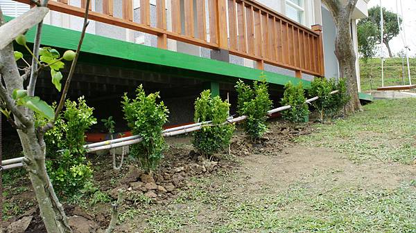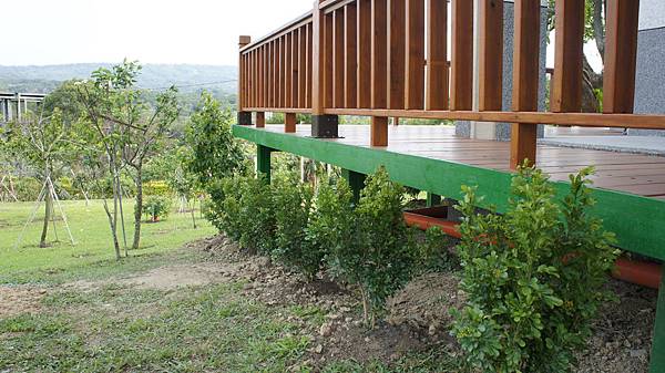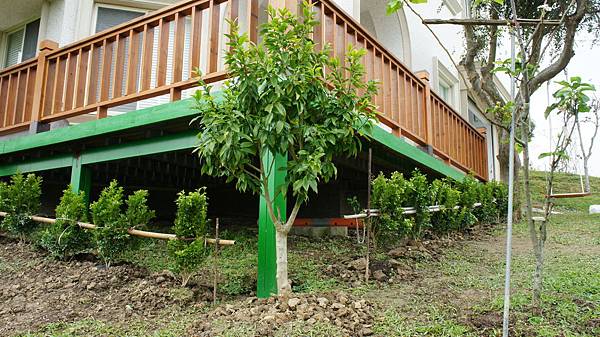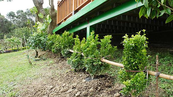 農舍周圍木棧道下方空隙難看,封板不美還怕藏蛇,決定植樹來遮掩,樹種幾經考量後決定植珠蘭。