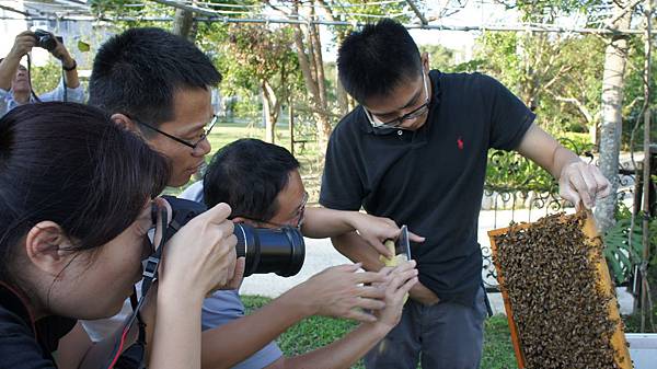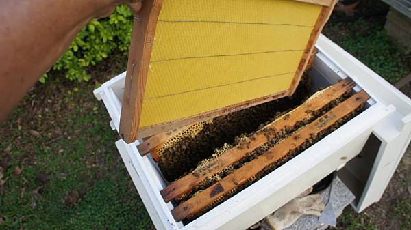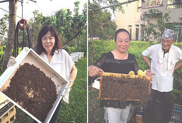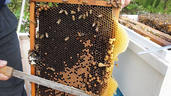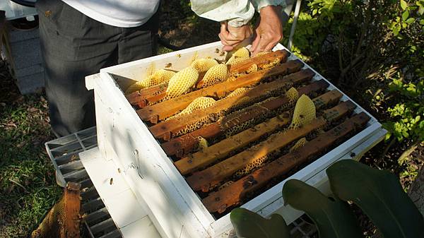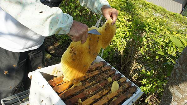 自養蜂後社區鄰居都興趣盎然,爭相來觀察蜜蜂動態,因蜂群旺盛住不下,頂蓋箱壁頻頻蓋違建,老農每週整理蜂箱要割除許多蠟巢,割下之巢孔中有少許蜂蜜,人人爭相嚐試直呼香甜,還要拿著佈滿蜜蜂的巢片照相。