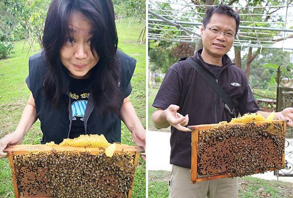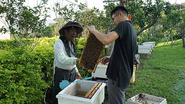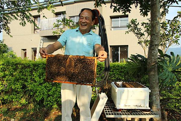 春天農莊家家種花.果.菜..,再加以人人重養生,都是有機栽培,無農藥毒害,蜂群成長旺盛,巢片一加再加已排滿,並且工蜂個頭也明顯大了些。蜂農老師對春天養蜂環境稱羡不已,希望能將他的育種蜂四箱借放于此,楊老農欣然同意這樣安排,因之老師要常來整理蜂巢,學生也能多學些技藝兩蒙其利。1123-12. 1104-2.
