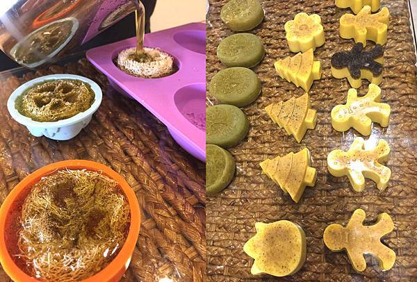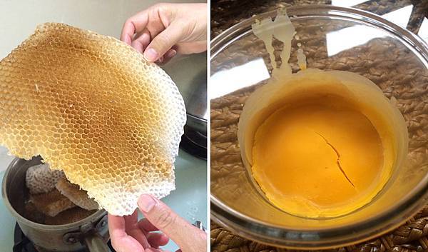 D園夫人多才多藝,將割除之蜂巢熬煮為蜂臘,配上皂基再加各種果菜等作成蜂蜜香皂,有的再加塊絲瓜巾,更具清潔效果,楊老農現在每天用的就是鑲絲瓜巾的辣椒蜂蜜皂。