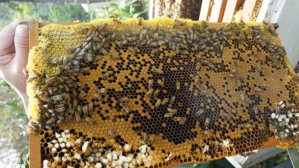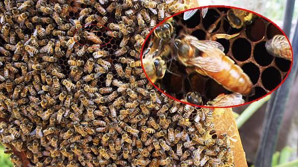 因為蜂群擁擠,巢片上層層疊疊佈滿蜜蜂,兩個月來逐片檢查整理,同時想看看蜂王,但是都不見芳蹤,直到月前才得一睹蜂王英姿,這隻蜂王腹部金黃沒有棕色斑,是隻年輕蜂王,蜂王也叫母蜂或蜂后,每個蜂群只有一隻,腹部較長身體比工蜂長1/3,腹下無蜡腺後足無花粉籃,翅膀僅覆蓋腹部的一半,蜂王壽命約3~5年,是工蜂壽命的卄倍。