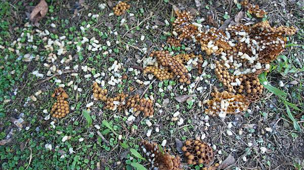 蜂群過於擁擠,工蜂認為該分家了,會建造王台培養新蜂王,有個大王台已封蓋化蛹,必須在新王羽化出繭前分蜂,因蜂群太密集難覓老蜂王,連續三天多次逐板檢查都不見芳蹤。今老師出馬總算找到老蜂王,大家歡愉搶拍蜂王芳姿,老蜂王順利移入新蜂箱,再抖些工蜂及調三片蜂巢到新箱,也加放一片新巢板,總算完成分蜂大事,現有六箱蜜蜂一字排開聲勢浩大。