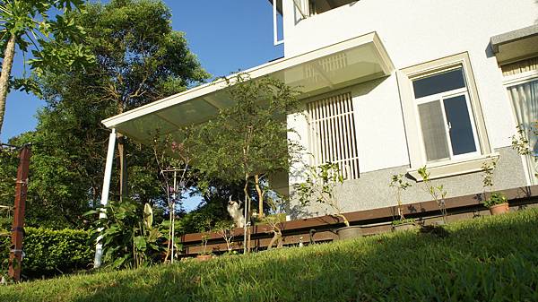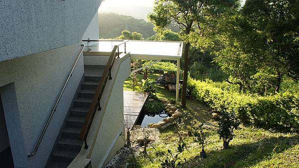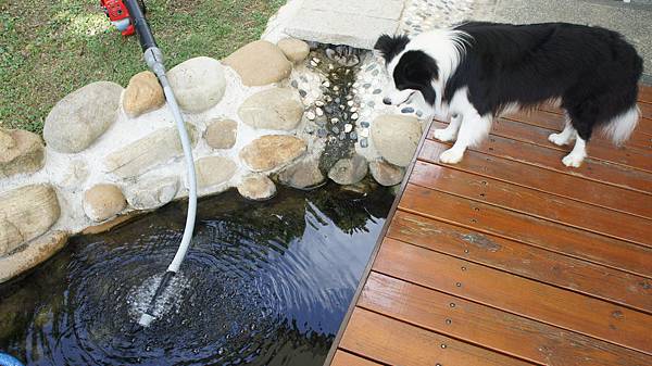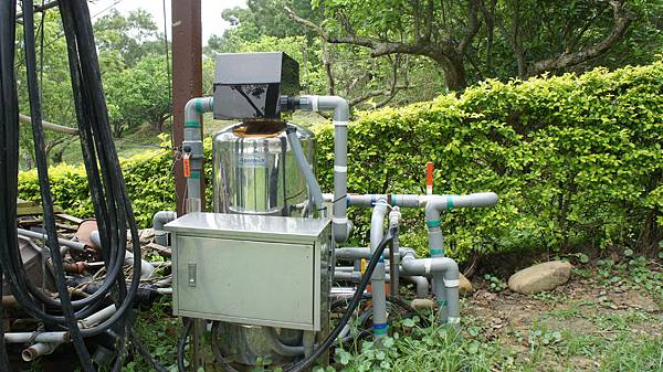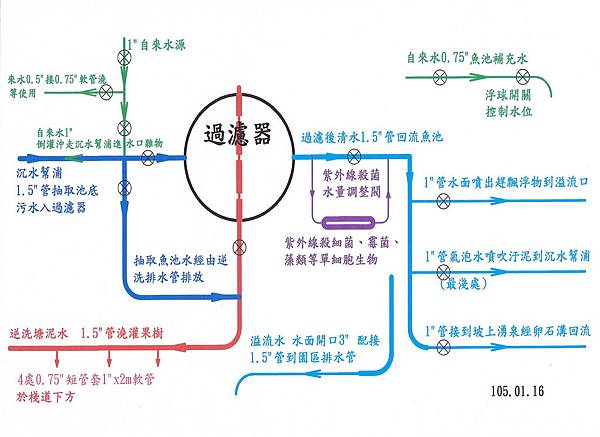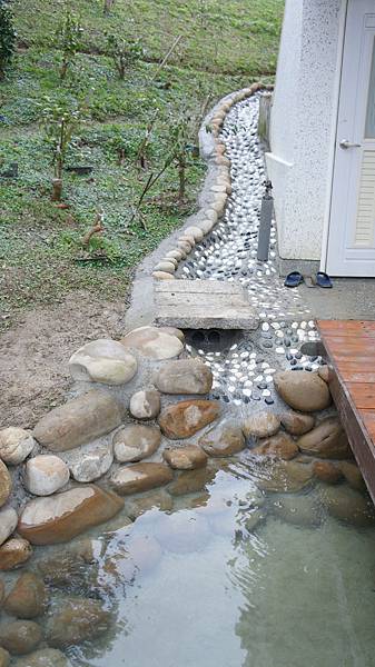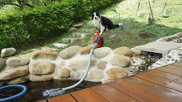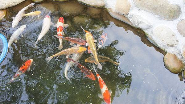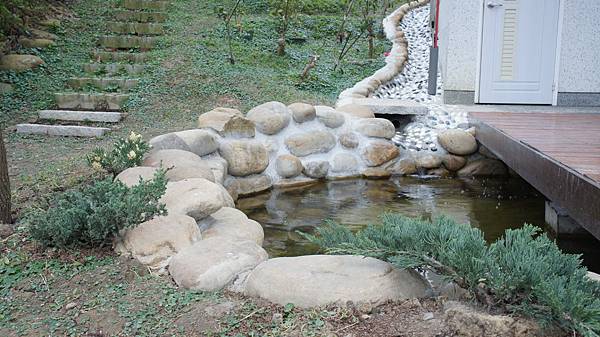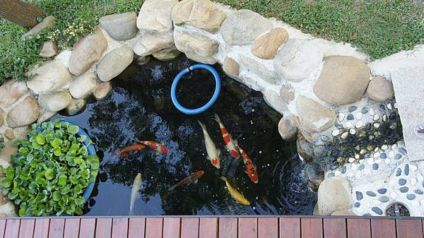 三叔飼養錦鯉魚多年繁殖逾百條,敦促要建魚池分養,年初動土於農舍東南角挖魚池,魚池一半在棧道下方,一則為省地方再者讓魚兒有陰涼棲息處,魚池裝設自動逆洗之過濾設備,管線設計多功能利用,濾清之水經紫外線將細菌、霉菌、微生物、藻類等單細胞生物DNA產生光化反應殺死。再引至屋後坡上經水道回流,流水波動增加水溶氧,躍過卵石潺潺之音悅耳,每日自動換水1/10,作為逆洗濾材之用,污水排放果園施肥又灌溉。