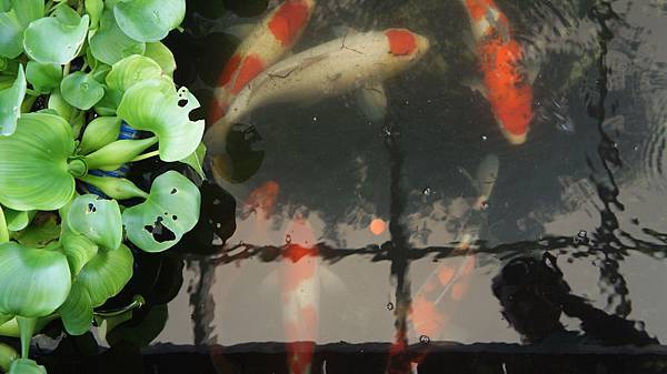 水池建成加千分之五粗鹽養水兩個月,換水幾次充分去除水泥鹼性,待池壁有青苔附著才接魚,載魚袋放入池中調適新環境溫度後再正式入新居。十二條紅.白.黃各色大錦鯉魚,魚兒在福盧適應狀況良好,寧餓勿脹牠們吃不飽就啃青苔嚼布袋蓮,有人來看牠們時會出來等吃。